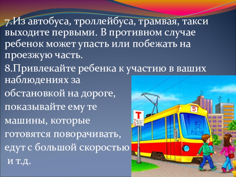 Слайд 237.Из автобуса, троллейбуса, трамвая, такси выходите первыми. В противном случае ребенок