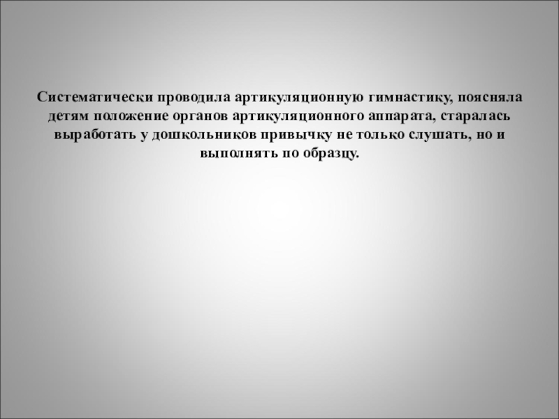 Слайд 12Систематически проводила артикуляционную гимнастику, поясняла детям положение органов артикуляционного аппарата, старалась