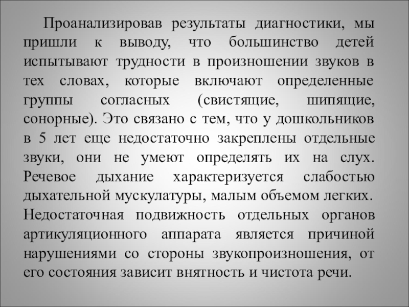 трудности в произношении звуков в тех словах, которые включают определенные группы согласных (свистящие, шипящие, сонорные). Это связано с тем, что у дошкольников в 5 лет еще недостаточно закреплены отдельные звуки, они не умеют определять их на слух. Речевое дыхание характеризуется слабостью дыхательной мускулатуры, малым объемом легких. Недостаточная подвижность отдельных органов артикуляционного аппарата является причиной нарушениями со стороны звукопроизношения, от его состояния зависит внятность и чистота речи.