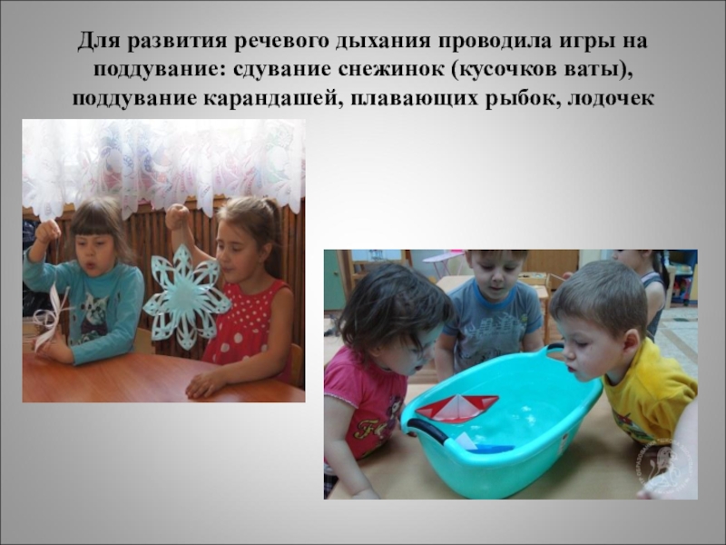 Слайд 15Для развития речевого дыхания проводила игры на поддувание: сдувание снежинок (кусочков