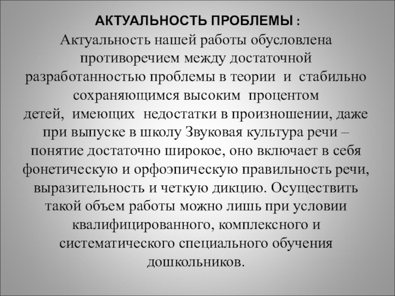 в теории и стабильно сохраняющимся высоким процентом детей, имеющих недостатки в произношении, даже при выпуске в школу Звуковая культура речи – понятие достаточно широкое, оно включает в себя фонетическую и орфоэпическую правильность речи, выразительность и четкую дикцию. Осуществить такой объем работы можно лишь при условии квалифицированного, комплексного и систематического специального обучения дошкольников.