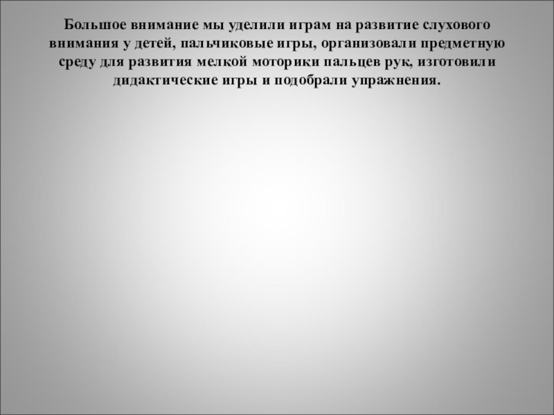 Слайд 11Большое внимание мы уделили играм на развитие слухового внимания у детей,