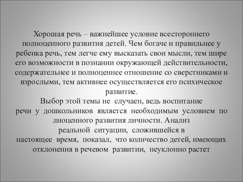 Выбор этой темы не случаен, ведь воспитание речи у дошкольников является необходимым условием полноценного развития личности. Анализ реальной ситуации, сложившейся в настоящее время, показал, что количество детей, имеющих отклонения в речевом развитии, неуклонно растет