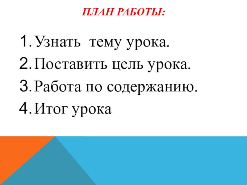 ПЛАН РАБОТЫ: Узнать тему урока.Поставить цель урока.Работа по содержанию.Итог урока