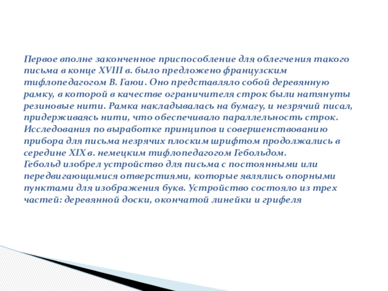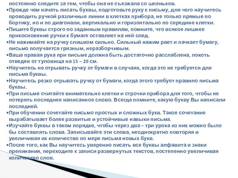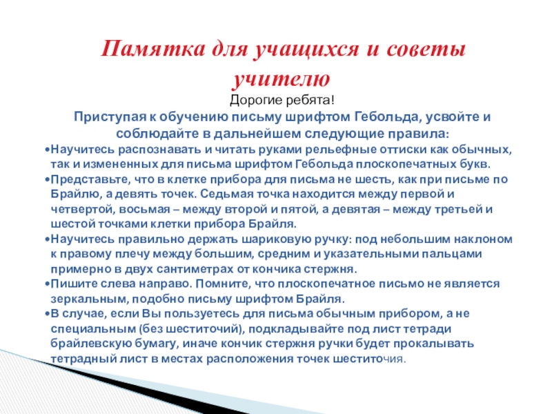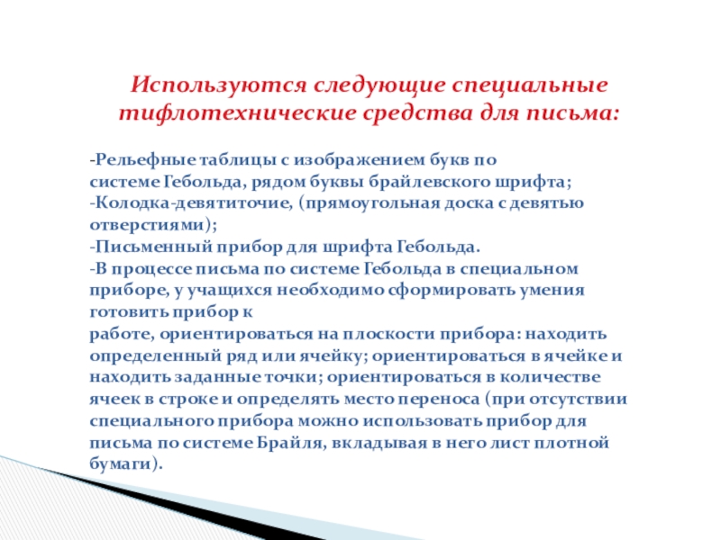 Обучение плоскому письму в школах для детей с ОВЗ 3-4 вида проводится, как правило, в начальных классах. Обучение целесообразно начинать со 2 класса. К этому времени ребенок уже овладел шрифтом Брайля, и учитель имеет возможность заниматься плоским письмом на коррекционных