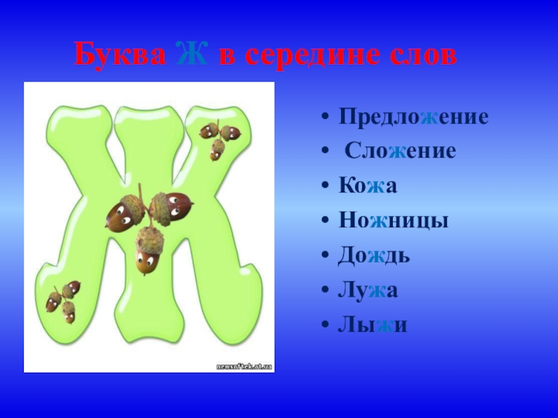 Буква Ж в середине словПредложение СложениеКожаНожницыДождьЛужаЛыжи