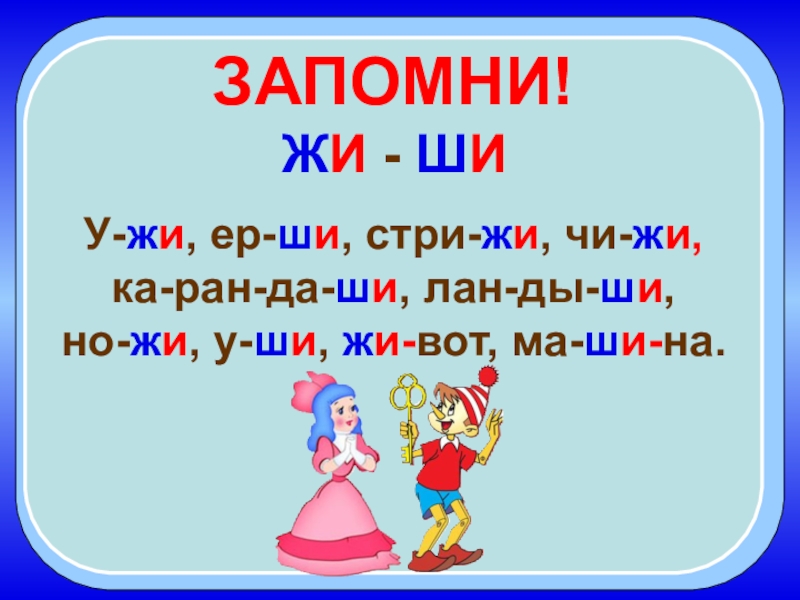 ЗАПОМНИ!ЖИ - ШИ У-жи, ер-ши, стри-жи, чи-жи, ка-ран-да-ши, лан-ды-ши, но-жи, у-ши, жи-вот, ма-ши-на.