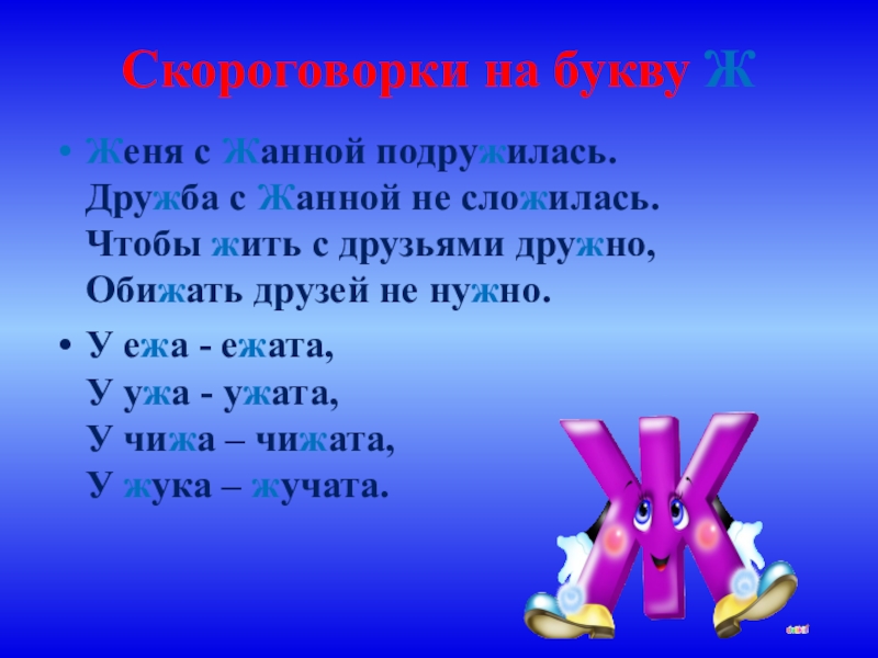 Скороговорки на букву Ж Женя с Жанной подружилась. Дружба с Жанной не сложилась. Чтобы жить с друзьями дружно, Обижать друзей не нужно.У ежа - ежата,  У ужа - ужата, У чижа – чижата, У жука
