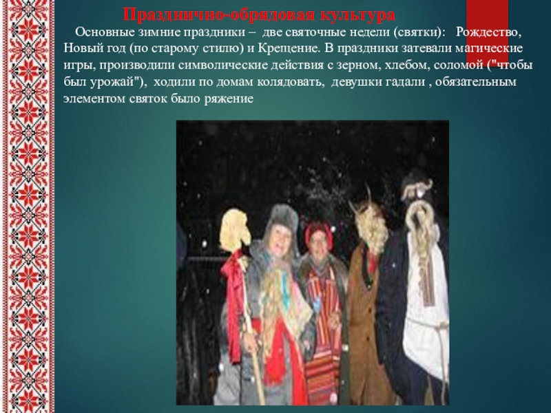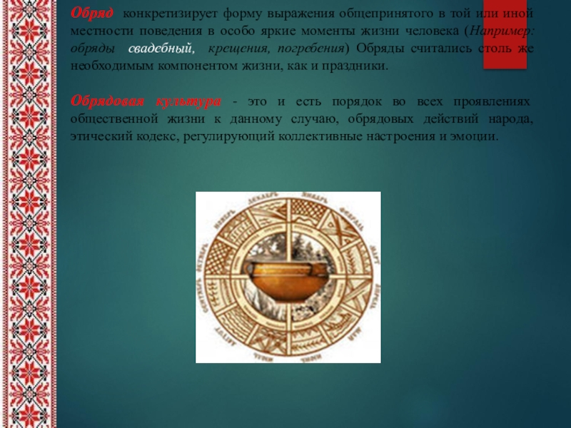 «Традиция», «обычай», «обряд» - важнейшие элементы культуры каждого народа , эти слова всем знакомы, вызывают в памяти определённые ассоциации и обычно бывают связаны с воспоминаниями о той, «ушедшей Руси». Неоценимая ценность традиций, обычаев и обрядов в том, что они свято хранят и воспроизводят духовный облик того или иного народа, его уникальные особенности, аккумулируя в себе весь накопленный культурный опыт многих поколений людей, привносят в нашу жизнь всё самое лучшее из духовного наследия народа. Благодаря традициям, обычаям и обрядам народы наиболее всего и отличается один от другого.