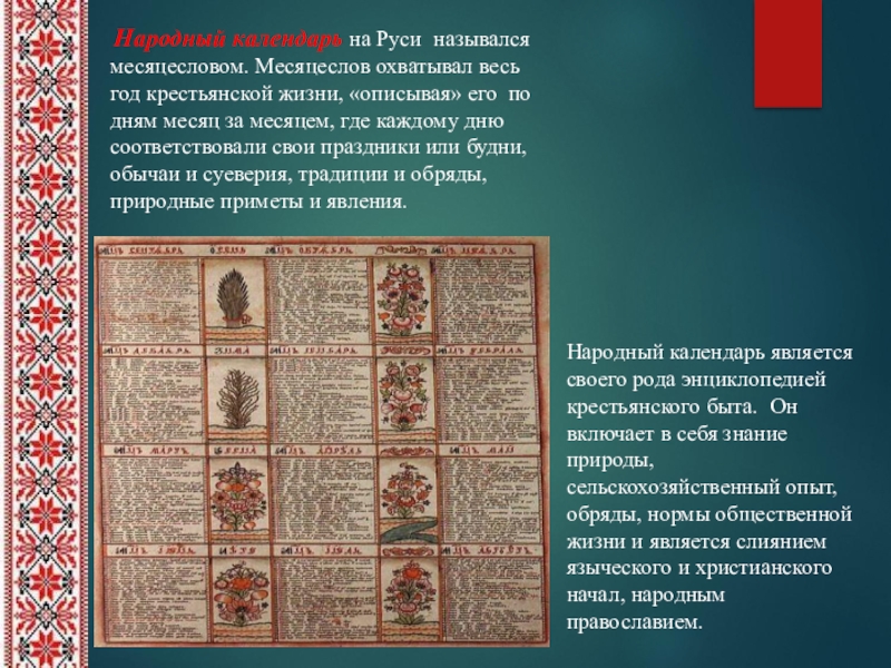 Народный календарь является своего рода энциклопедией крестьянского быта. Он включает в себя знание природы, сельскохозяйственный опыт, обряды, нормы общественной жизни и является слиянием языческого и христианского начал, народным православием.