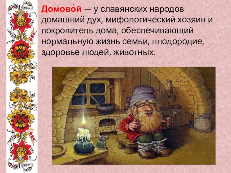 Слайд 24Домово́й — у славянских народов домашний дух, мифологический хозяин и покровитель дома, обеспечивающий