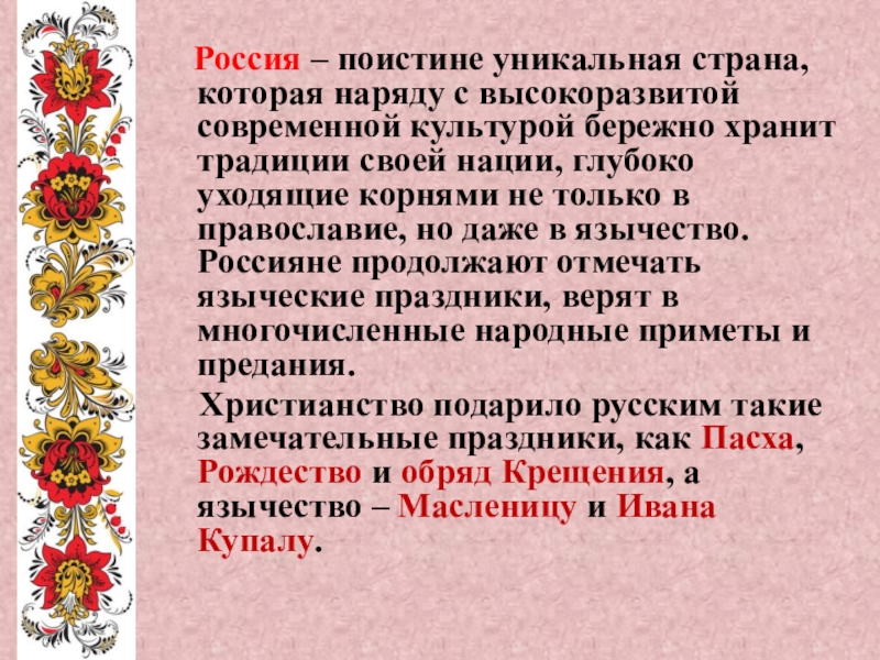 высокоразвитой современной культурой бережно хранит традиции своей нации, глубоко уходящие корнями не только в православие, но даже в язычество. Россияне продолжают отмечать языческие праздники, верят в многочисленные народные приметы и предания.