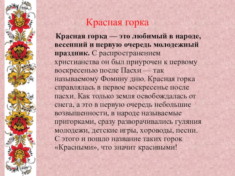 весенний и первую очередь молодежный праздник. С распространением христианства он был приурочен к первому воскресенью после Пасхи — так называемому Фомину дню. Красная горка справлялась в первое воскресенье после пасхи. Как только земля освобождалась от снега, а это в первую очередь небольшие возвышенности, в народе называемые пригорками, сразу разворачивались гуляния молодежи, детские игры, хороводы, песни. С этого и пошло название таких горок «Красными», что значит красивыми!