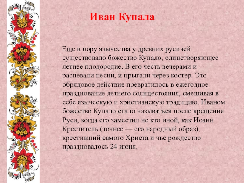 существовало божество Купало, олицетворяющее летнее плодородие. В его честь вечерами и распевали песни, и прыгали через костер. Это обрядовое действие превратилось в ежегодное празднование летнего солнцестояния, смешивая в себе языческую и христианскую традицию. Иваном божество Купало стало называться после крещения Руси, когда его заместил не кто иной, как Иоанн Креститель (точнее — его народный образ), крестивший самого Христа и чье рождество праздновалось 24 июня.