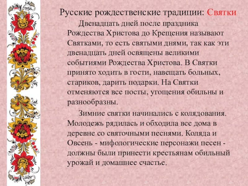 праздника Рождества Христова до Крещения называют Святками, то есть святыми днями, так как эти двенадцать дней освящены великими событиями Рождества Христова. В Святки принято ходить в гости, навещать больных, стариков, дарить подарки. На Святки отменяются все посты, угощения обильны и разнообразны.