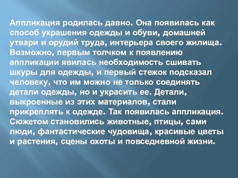 домашней утвари и орудий труда, интерьера своего жилища. Возможно, первым толчком к появлению аппликации явилась необходимость сшивать шкуры для одежды, и первый стежок подсказал человеку, что им можно не только соединять детали одежды, но и украсить ее. Детали, выкроенные из этих материалов, стали прикреплять к одежде. Так появилась аппликация. Сюжетом становились животные, птицы, сами люди, фантастические чудовища, красивые цветы и растения, сцены охоты и повседневной жизни.