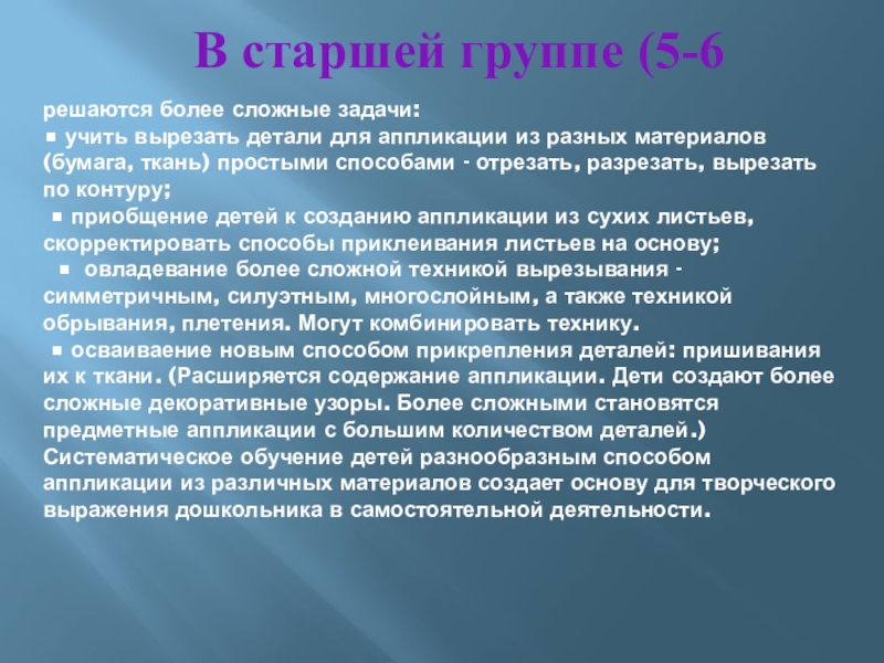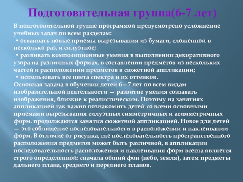 Основная задача в обучении детей 6—7 лет по всем видам изобразительной деятельности — развитие умения создавать изображения, близкие к реалистическим. Поэтому на занятиях аппликацией так важно познакомить детей со всеми основными приемами вырезывания силуэтных симметричных и асимметричных форм. продолжаются занятия сюжетной аппликацией. Новое для детей — это соблюдение последовательности в расположении и наклеивании форм. В отличие от рисунка, где последовательность пространственного расположения предметов может быть различной, в аппликации последовательность расположения и наклеивания форм всегда является строго определенной: сначала общий фон (небо, земля), затем предметы дальнего плана, среднего и переднего планов.