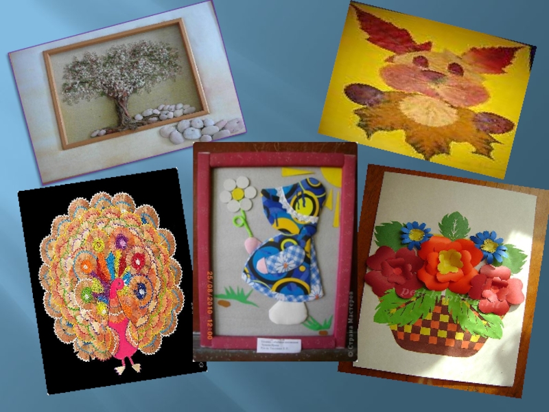 или целых картин из кусочков бумаги, ткани, кожи, меха, войлока, цветные бусины, бисер, шерстяные нити, металлические чеканные пластины, высушенные листья.