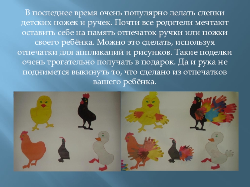Слайд 13В последнее время очень популярно делать слепки детских ножек и ручек.