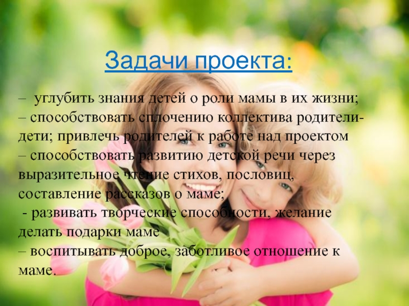 Задачи проекта:– углубить знания детей о роли мамы в их жизни;– способствовать сплочению коллектива родители-дети; привлечь родителей