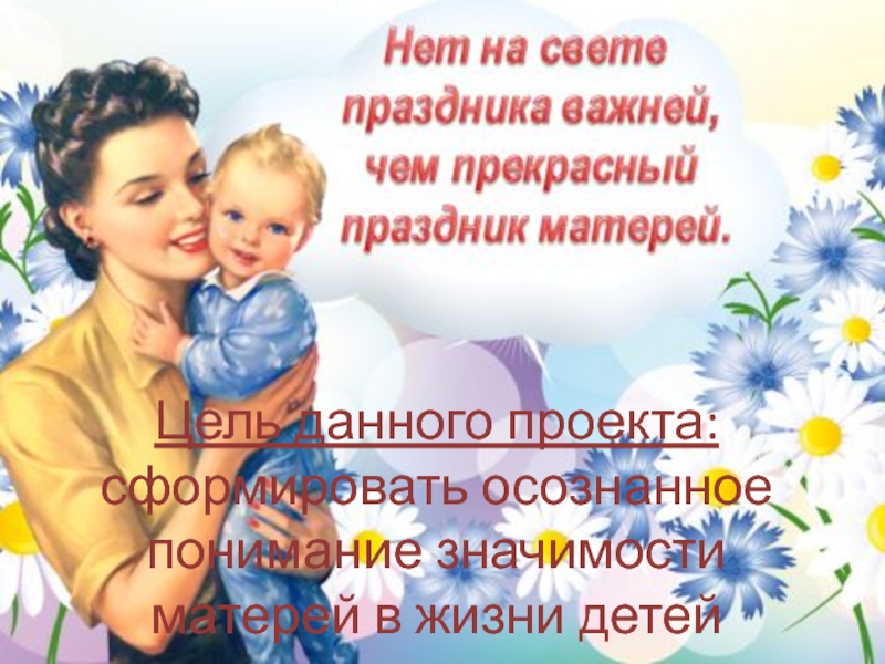 Слайд 2Цель данного проекта: сформировать осознанное понимание значимости матерей в жизни детей