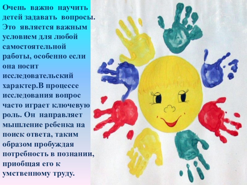 любой самостоятельной работы, особенно если она носит исследовательский характер.В процессе исследования вопрос часто играет ключевую роль. Он направляет мышление ребенка на поиск ответа, таким образом пробуждая потребность в познании, приобщая его к умственному труду.