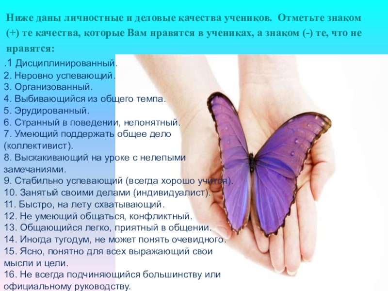 Слайд 8Ниже даны личностные и деловые качества учеников. Отметьте знаком (+) те