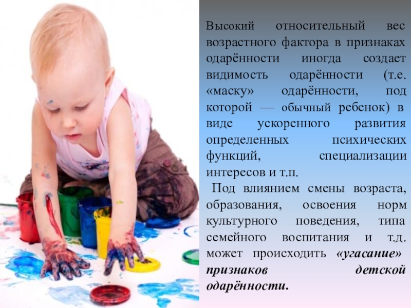 Под влиянием смены возраста, образования, освоения норм культурного поведения, типа семейного воспитания и т.д. может происходить «угасание» признаков детской одарённости.