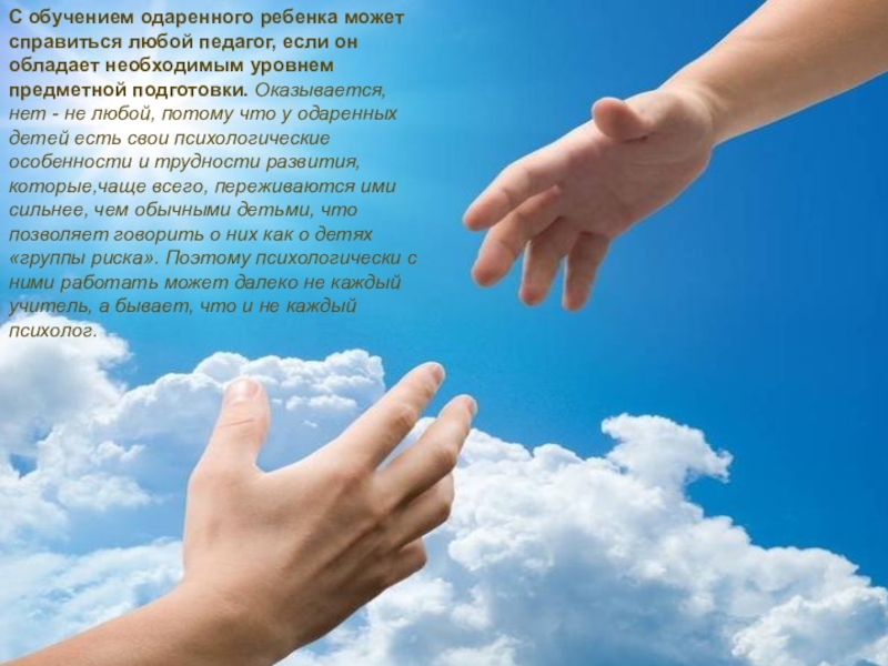 необходимым уровнем предметной подготовки. Оказывается, нет - не любой, потому что у одаренных детей есть свои психологические особенности и трудности развития, которые,чаще всего, переживаются ими сильнее, чем обычными детьми, что позволяет говорить о них как о детях «группы риска». Поэтому психологически с ними работать может далеко не каждый учитель, а бывает, что и не каждый психолог.