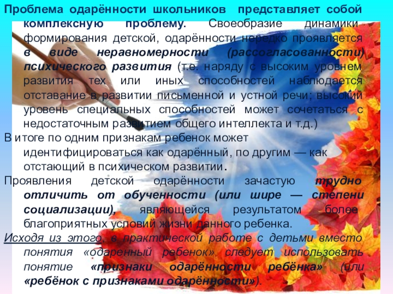 Слайд 5Проблема одарённости школьников представляет собой комплексную проблему. Своеобразие динамики формирования детской,