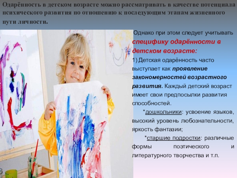 Однако при этом следует учитывать специфику одарённости в детском возрасте: