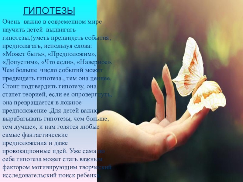 события, предполагать, используя слова: «Может быть», «Предположим», «Допустим», «Что если», «Наверное». Чем больше число событий может предвидеть гипотеза., тем она ценнее. Стоит подтвердить гипотезу, она станет теорией, если ее опровергнуть, она превращается в ложное предположение .Для детей важно вырабатывать гипотезы, чем больше, тем лучше», и нам годятся любые самые фантастические предположения и даже провокационные идей. Уже сама по себе гипотеза может стать важным фактором мотивирующим творческий исследовательский поиск ребенка.