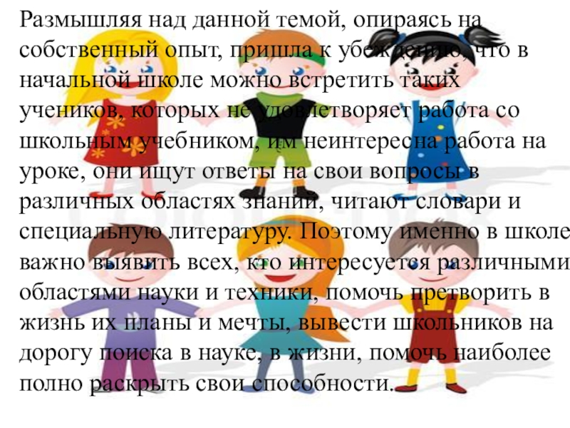 что в начальной школе можно встретить таких учеников, которых не удовлетворяет работа со школьным учебником, им неинтересна работа на уроке, они ищут ответы на свои вопросы в различных областях знаний, читают словари и специальную литературу. Поэтому именно в школе важно выявить всех, кто интересуется различными областями науки и техники, помочь претворить в жизнь их планы и мечты, вывести школьников на дорогу поиска в науке, в жизни, помочь наиболее полно раскрыть свои способности.