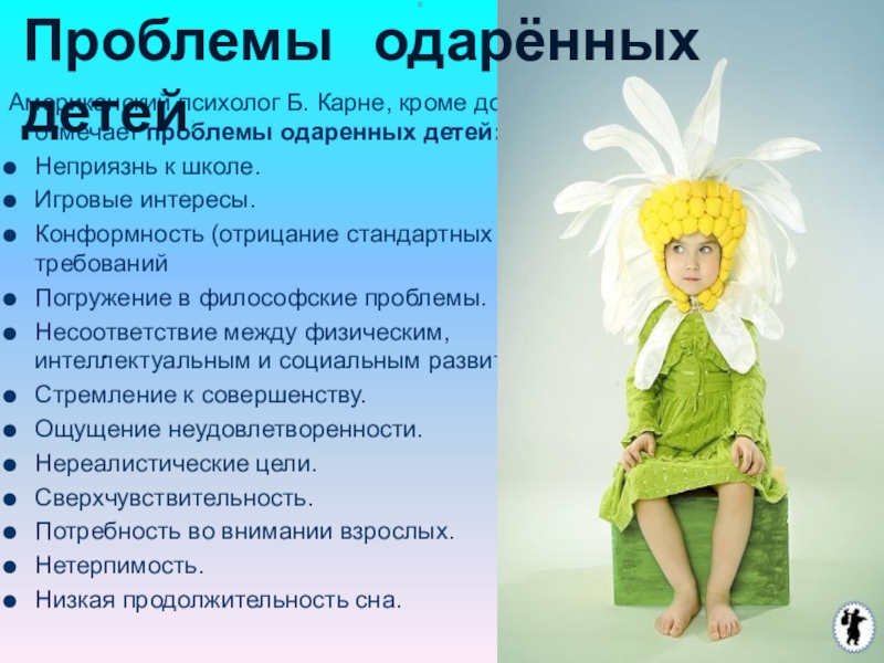 Американский психолог Б. Карне, кроме достоинств, отмечает проблемы одаренных детей: