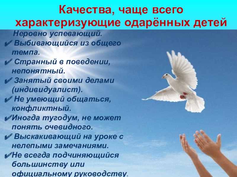Слайд 9Качества, чаще всего характеризующие одарённых детей