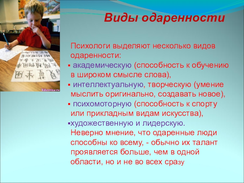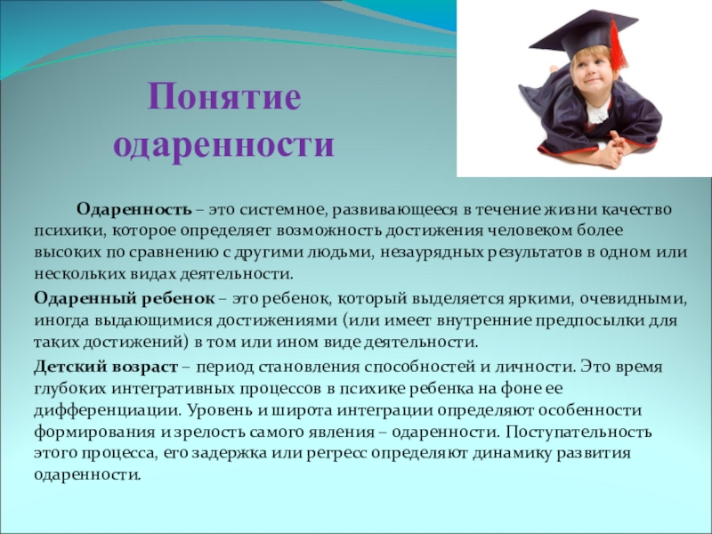 Одаренный ребенок – это ребенок, который выделяется яркими, очевидными, иногда выдающимися достижениями (или имеет внутренние предпосылки для таких достижений) в том или ином виде деятельности.