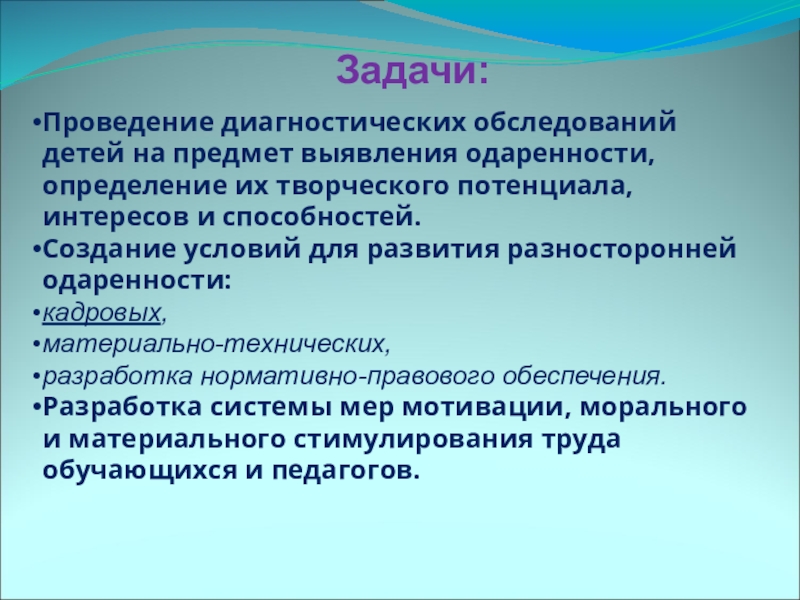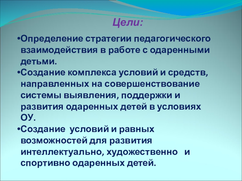 Создание условий и равных возможностей для развития интеллектуально, художественно и спортивно одаренных детей.
