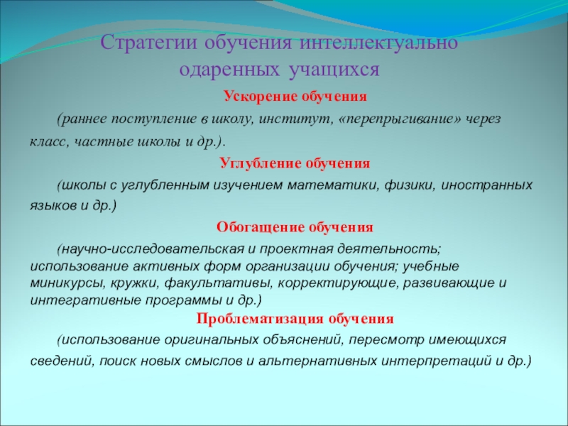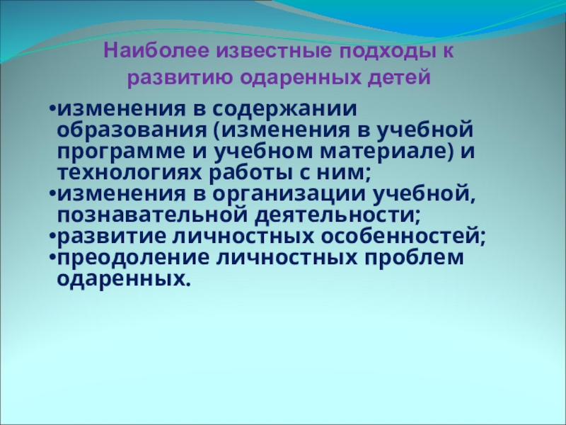 Слайд 11Наиболее известные подходы к развитию одаренных детей