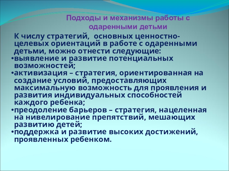 Слайд 9Подходы и механизмы работы с одаренными детьми