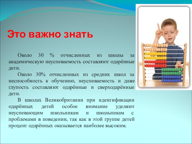 Около 30% отчисленных из средних школ за неспособность к обучению, неуспеваемость и даже глупость составляют одарённые и сверходарённые дети.
