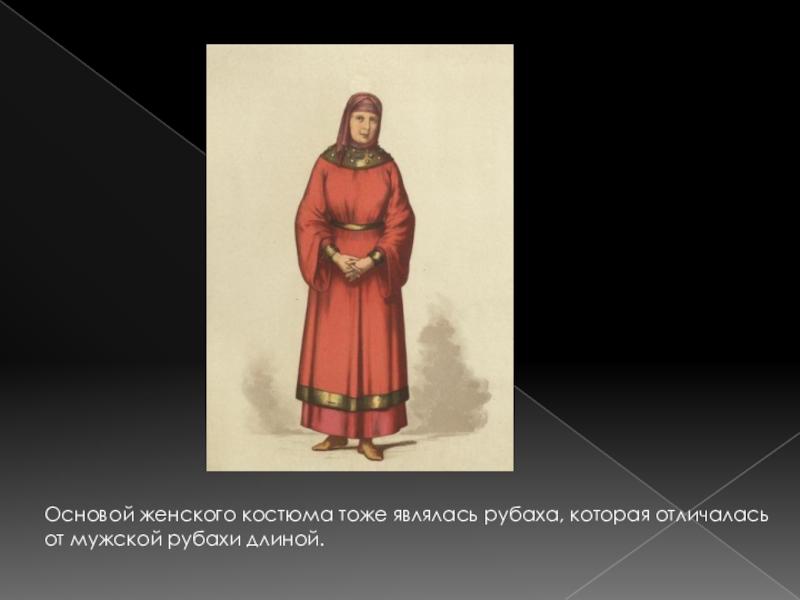 Слайд 5Основой женского костюма тоже являлась рубаха, которая отличалась от мужской рубахи