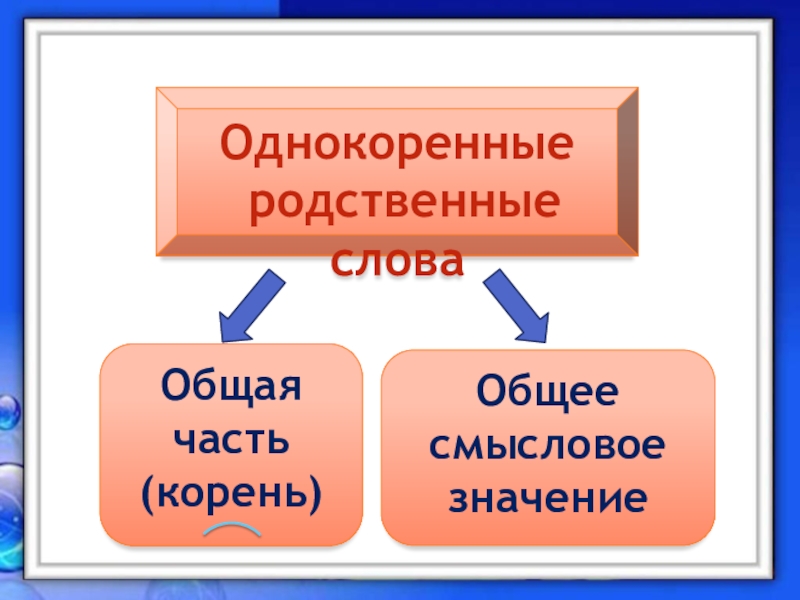 Однокоренные родственные словаОбщая часть(корень)Общеесмысловоезначение