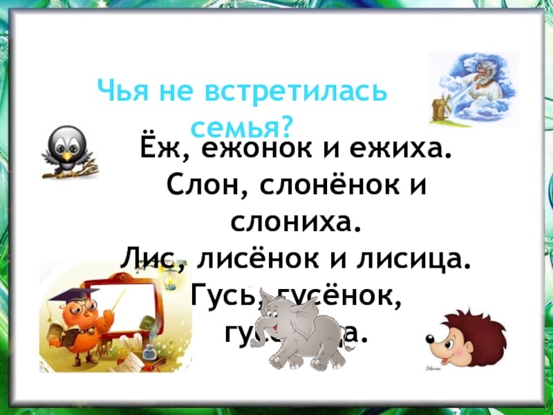 Ёж, ежонок и ежиха.Слон, слонёнок и слониха.Лис, лисёнок и лисица.Гусь, гусёнок, гусеница.Чья не встретилась семья?