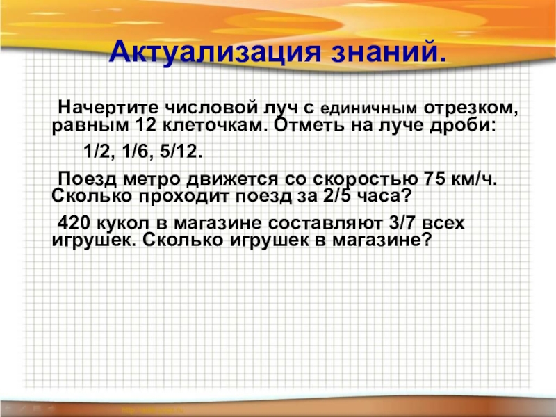Актуализация знаний.	Начертите числовой луч с единичным отрезком, равным 12 клеточкам. Отметь на луче дроби: 		1/2, 1/6, 5/12.	Поезд