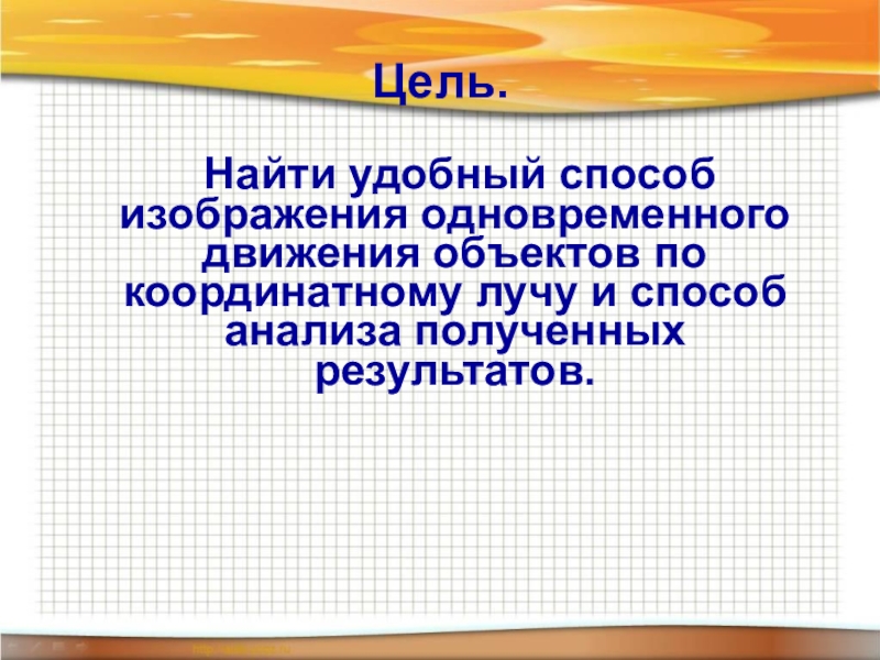 Цель.	Найти удобный способ изображения одновременного движения объектов по координатному лучу и способ анализа полученных результатов.