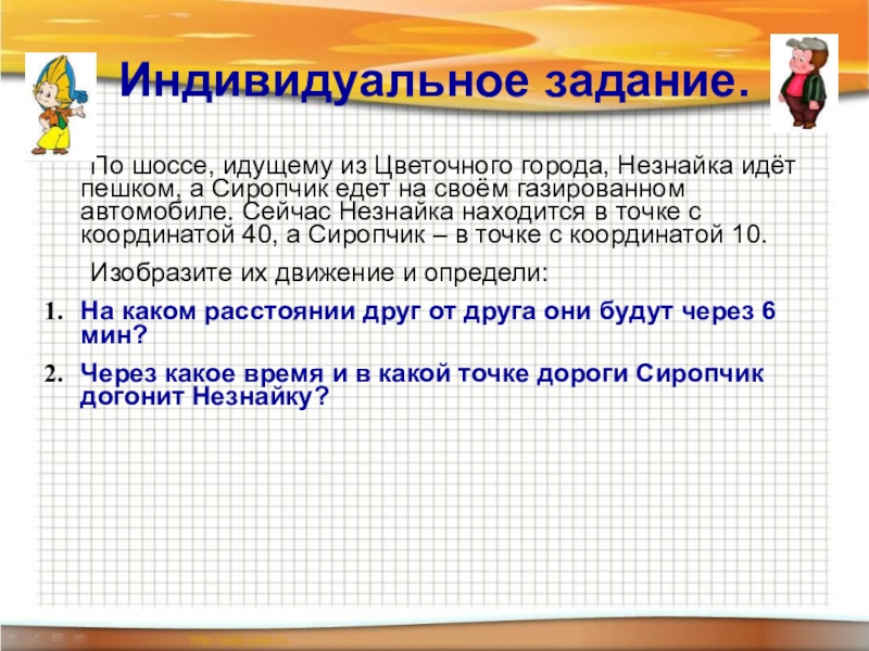 Индивидуальное задание.	По шоссе, идущему из Цветочного города, Незнайка идёт пешком, а Сиропчик едет на своём газированном автомобиле.