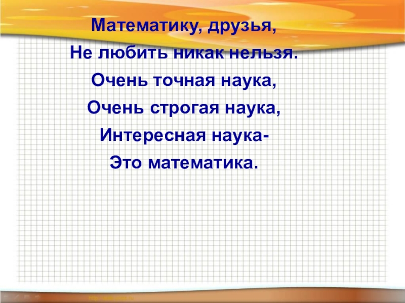 Математику, друзья,Не любить никак нельзя.Очень точная наука,Очень строгая наука,Интересная наука-Это математика.