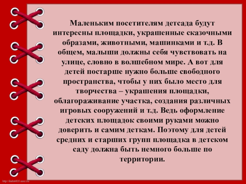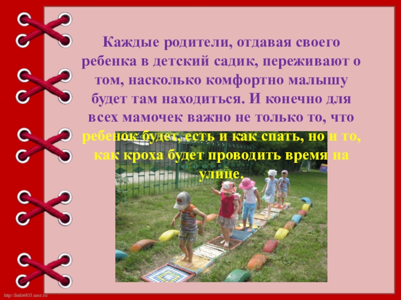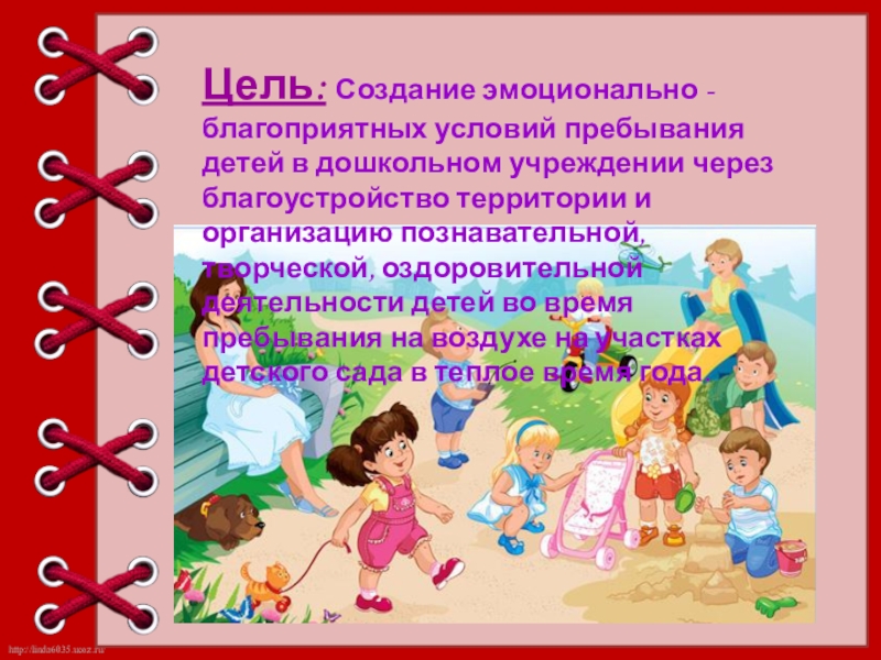 через благоустройство территории и организацию познавательной, творческой, оздоровительной деятельности детей во время пребывания на воздухе на участках детского сада в теплое время года.