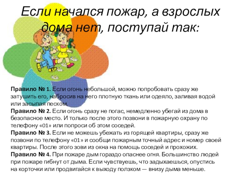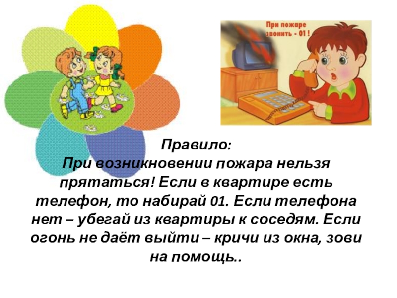 Правило № 3. Если не можешь убежать из горящей квартиры, сразу же позвони по телефону «01» и сообщи пожарным точный адрес и номер своей квартиры. После этого зови из окна на помощь соседей и прохожих.