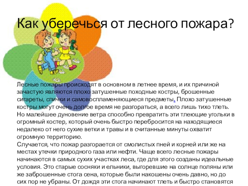 время, и их причиной зачастую являются плохо затушенные походные костры, брошенные сигареты, спички и самовоспламеняющиеся предметы. Плохо затушенные костры могут очень долгое время не разгораться, а всего лишь тихо тлеть. Но малейшее дуновение ветра способно превратить эти тлеющие угольки в огромный костер, который очень быстро перебросится на находящиеся недалеко от него сухие ветки и травы и в считанные минуты охватит огромную территорию.